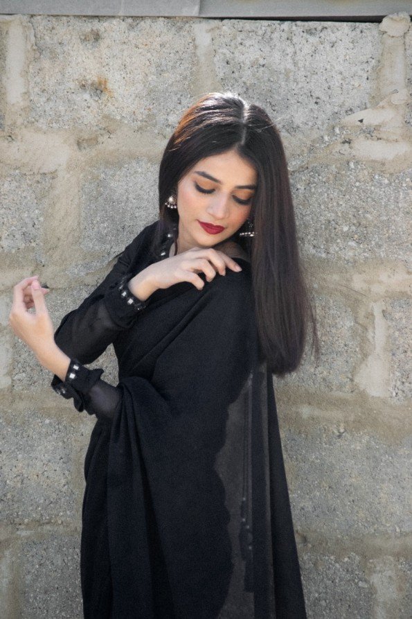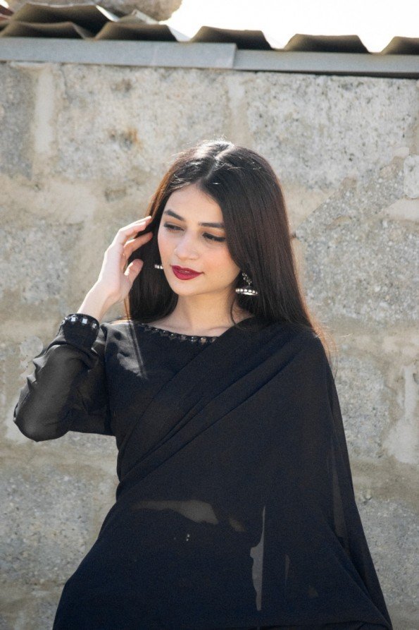 Stitched Black Chiffon Mirror Touch Saree