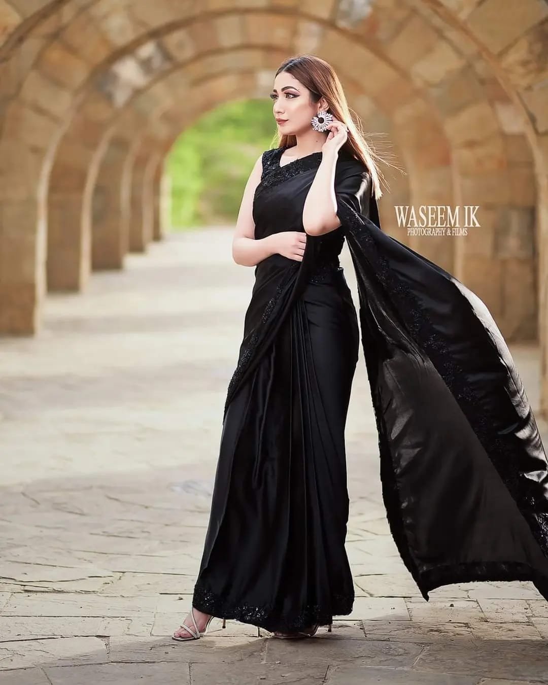 Stitched Black Silk Saree With Sequin Blouse & Borders